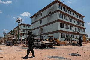 A Thai soldier stands guard near scam compounds, which the Thai military said were used for scam operations in the O’Smach area at the Chong Chom –O’Smach border crossing. April 7, 2026. REUTERS/Chalinee Thirasupa TPX