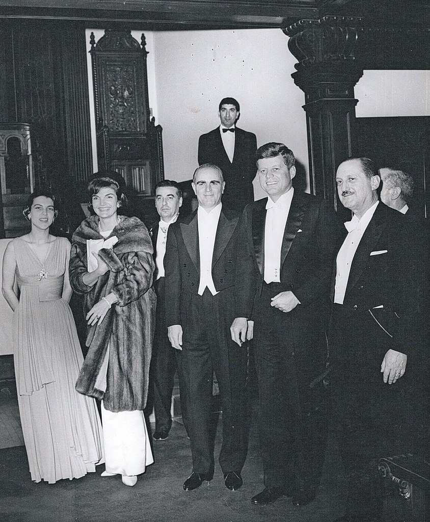 Konstantinos Karamanlis, his then wife Amalia Megapanou (left), John F. Kennedy and his wife Jackie, and Greek Foreign Minister Evangelos Averoff-Tossizza during the official luncheon held in honor of the American president at the Greek Embassy in Washington on April 19, 1961.