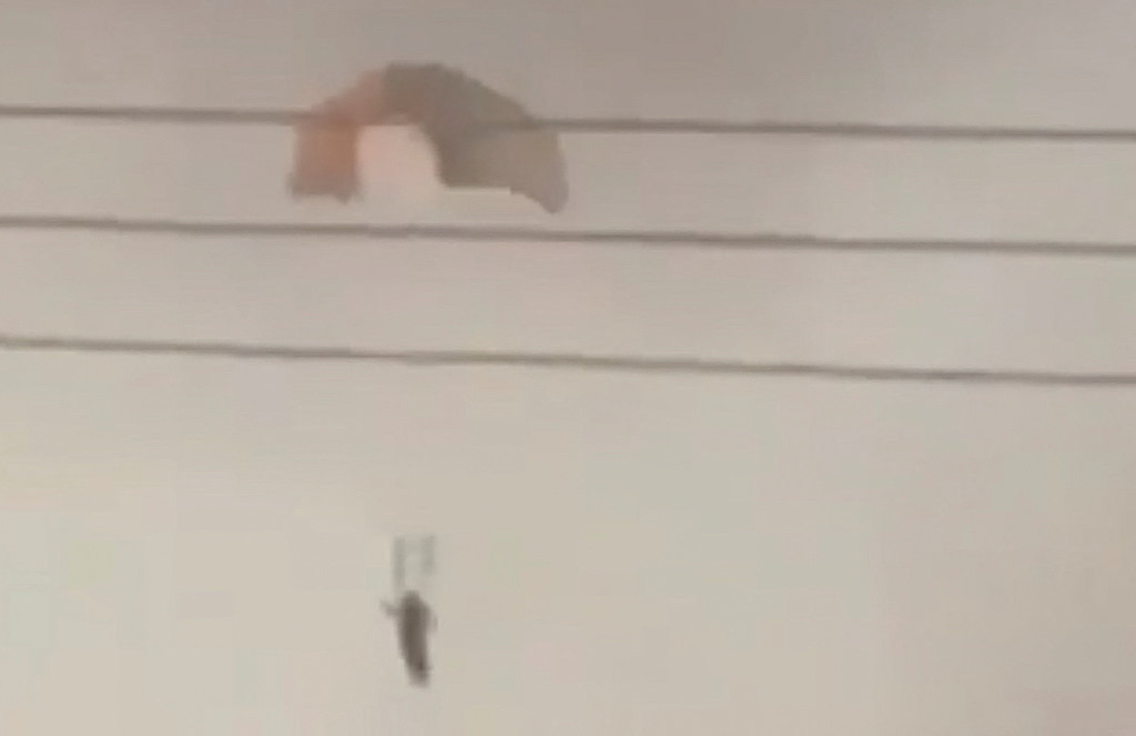 A person parachutes in Al Jahra, Kuwait, in this still image obtained from social media video released on March 2, 2026. Social Media/via REUTERS