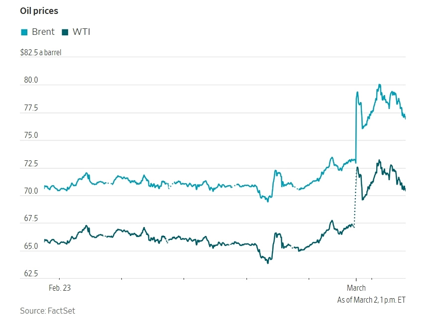 Oil prices surged after U.S. and Israeli strikes on Iran showed signs of sparking a widening conflict across the Middle East.