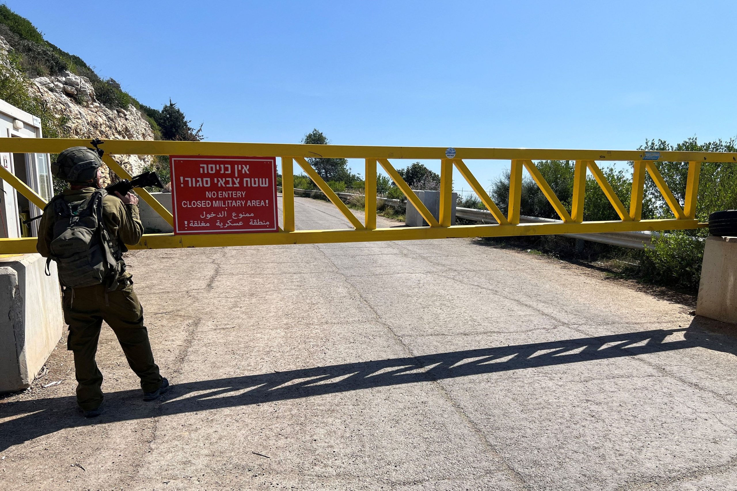 FILE PHOTO: An Israeli soldier stands next to a gate on a road near the Israel-Lebanon border, in Israel, March 12, 2025. REUTERS/Avi Ohayon/File Photo