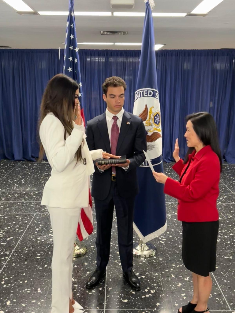 The ceremony at the US State Department was attended by Trump administration officials, political figures, and family members. Among those in attendance were Michael Rigas, the assistant secretary of state for management and resources; Michael Kratsios, director of the White House Office of Science and Technology Policy; Christos Marafatsos, president of the conservative Greek American group “Greeks for Trump”, as well as and Guilfoyle’s son.