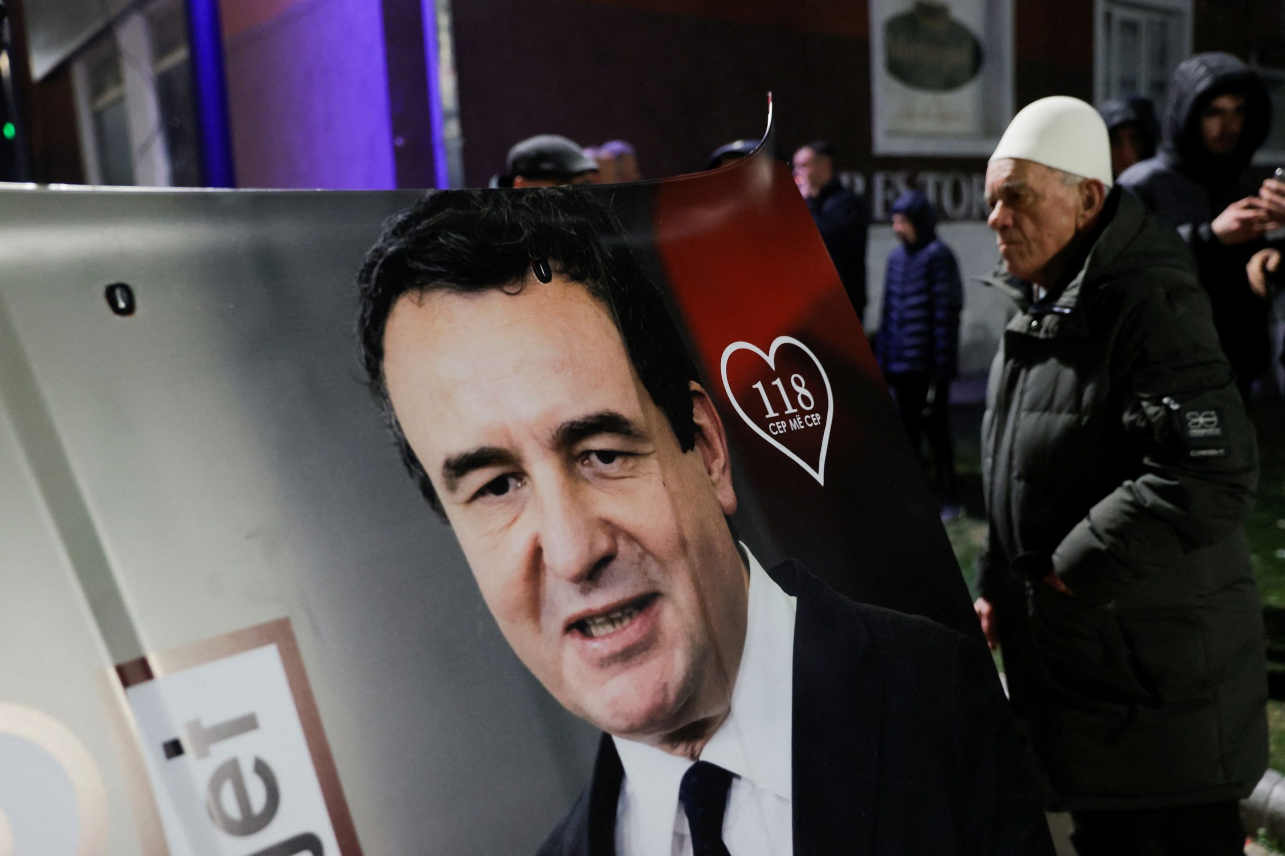 An image of Kosovo’s Prime Minister and leader of the ruling Vetevendosje party Albin Kurti is displayed during a gathering of supporters as an exit poll shows the party is set to come first in the parliamentary election, in Pristina, Kosovo February 9, 2025. REUTERS/Valdrin Xhemaj