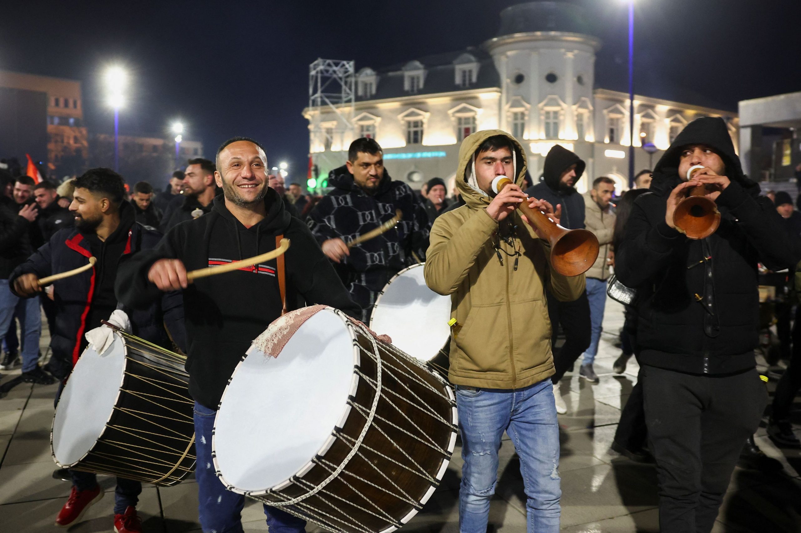 Supporters play instruments as exit polls show ruling Vetevendosje party is set to come first in the parliamentary election, in Pristina, Kosovo February 10, 2025. REUTERS/Florion Goga