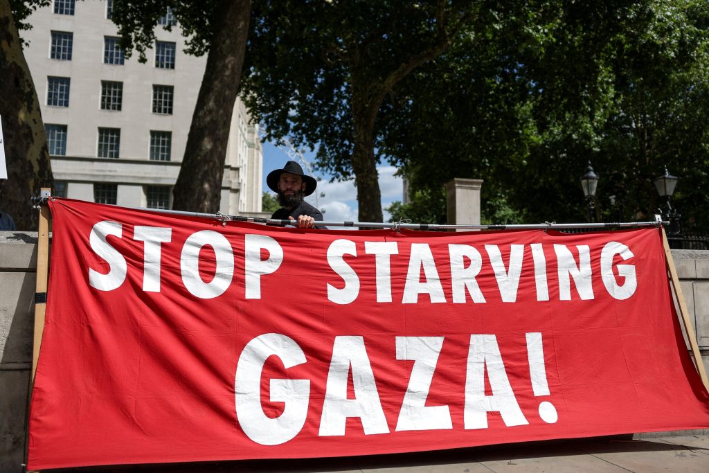 A man holds a placard during a protest to demand the immediate recognition of a Palestinian state and sanctions against Israel, as members of Britain’s Jewish community prepare to deliver a letter to British Prime Minister Keir Starmer, in London, Britain, August 5, 2025. REUTERS/Hannah McKay
