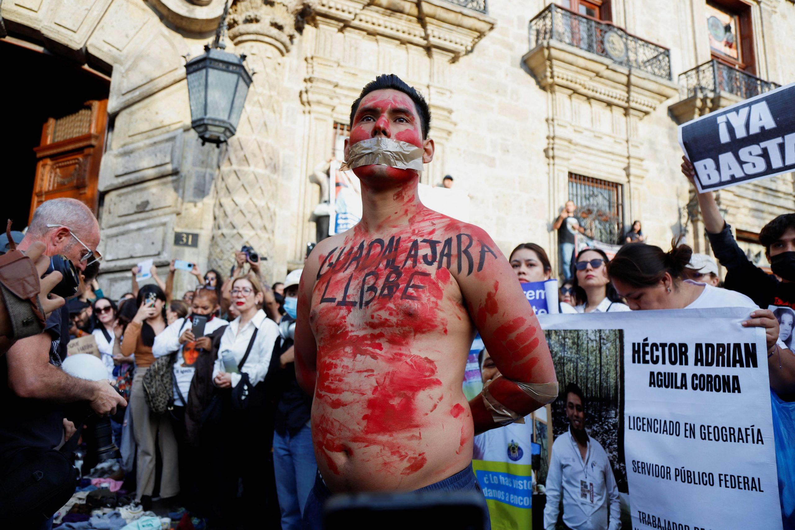 A demonstrator stands with letters painted on his chest that read “Guadalajara Free” during a vigil for the victims of the clandestine mass grave recently found in Teuchitlan, in the state of Jalisco, in Guadalajara, Mexico March 15, 2025. REUTERS/Michelle Freyria