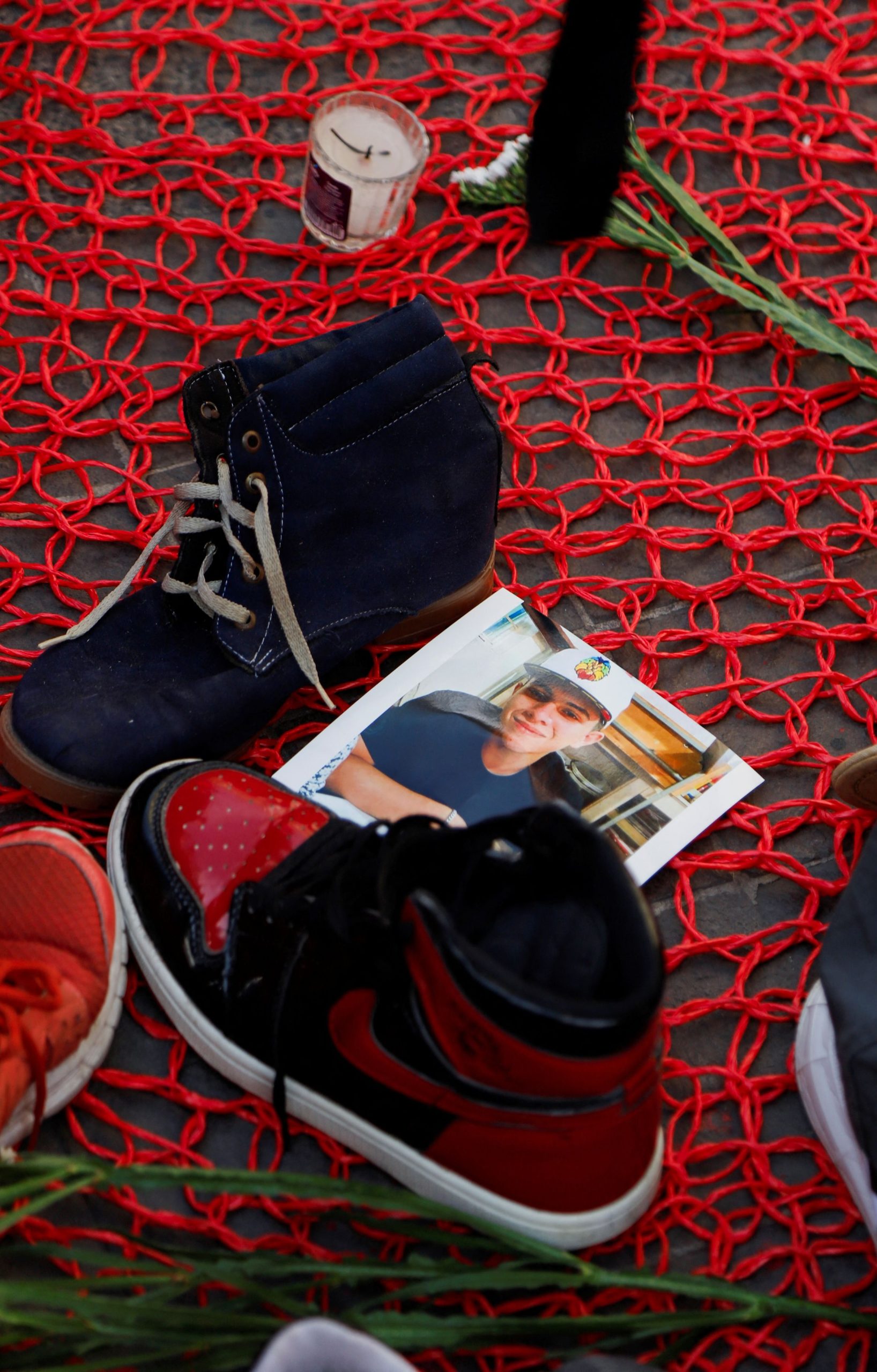 Pairs of shoes depicting victims are pictured during a vigil for the victims of the clandestine mass grave recently found in Teuchitlan, in the state of Jalisco, in Guadalajara, Mexico March 15, 2025. REUTERS/Michelle Freyria