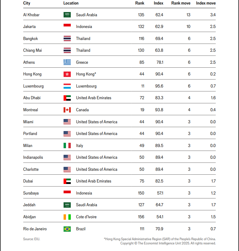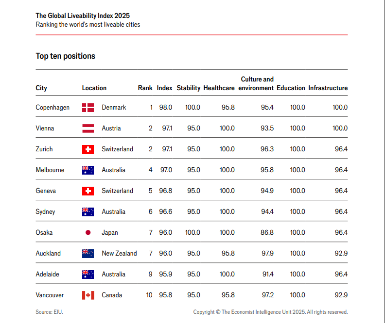 Three European cities top the list as the most livable in the world, according to the 2025 annual Economic Intelligence Unit (EIU) ranking.