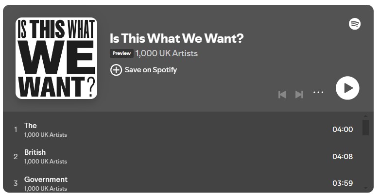 The silent album is made up of several recordings of empty studios and performance spaces, symbolizing the potential erasure of artists’ unique contributions if the changes are put into place. The album’s 12 tracks spell out the message “The British government must not legalise music theft to benefit AI companies.”
