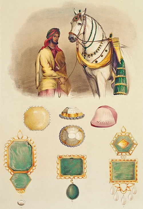 Lithograph showing one of the favourite horses of Maharaja Ranjit Singh with the head officer of his stables and his collection of fabulous jewels including the Kohinoor diamond marked as number 1. Public Domain via Wikimedia Commons