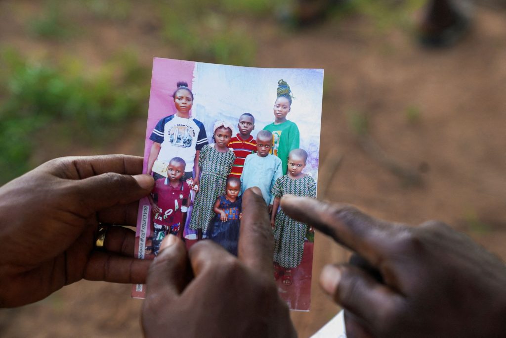 Fideles Adidi points at a picture of his family, who was killed during a deadly gunmen attack in Yelwata, Benue State, Nigeria, June 16, 2025. REUTERS/Marvellous Durowaiye NO RESALES. NO ARCHIVES