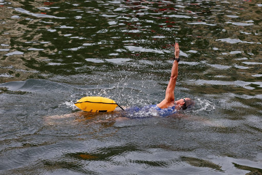 A person swims in the River Seine at the Bras Marie site, opened to swimmers marking the first public bathing session in the capital’s historic waterway, in Paris, France, July 5, 2025. REUTERS/Abdul Saboor