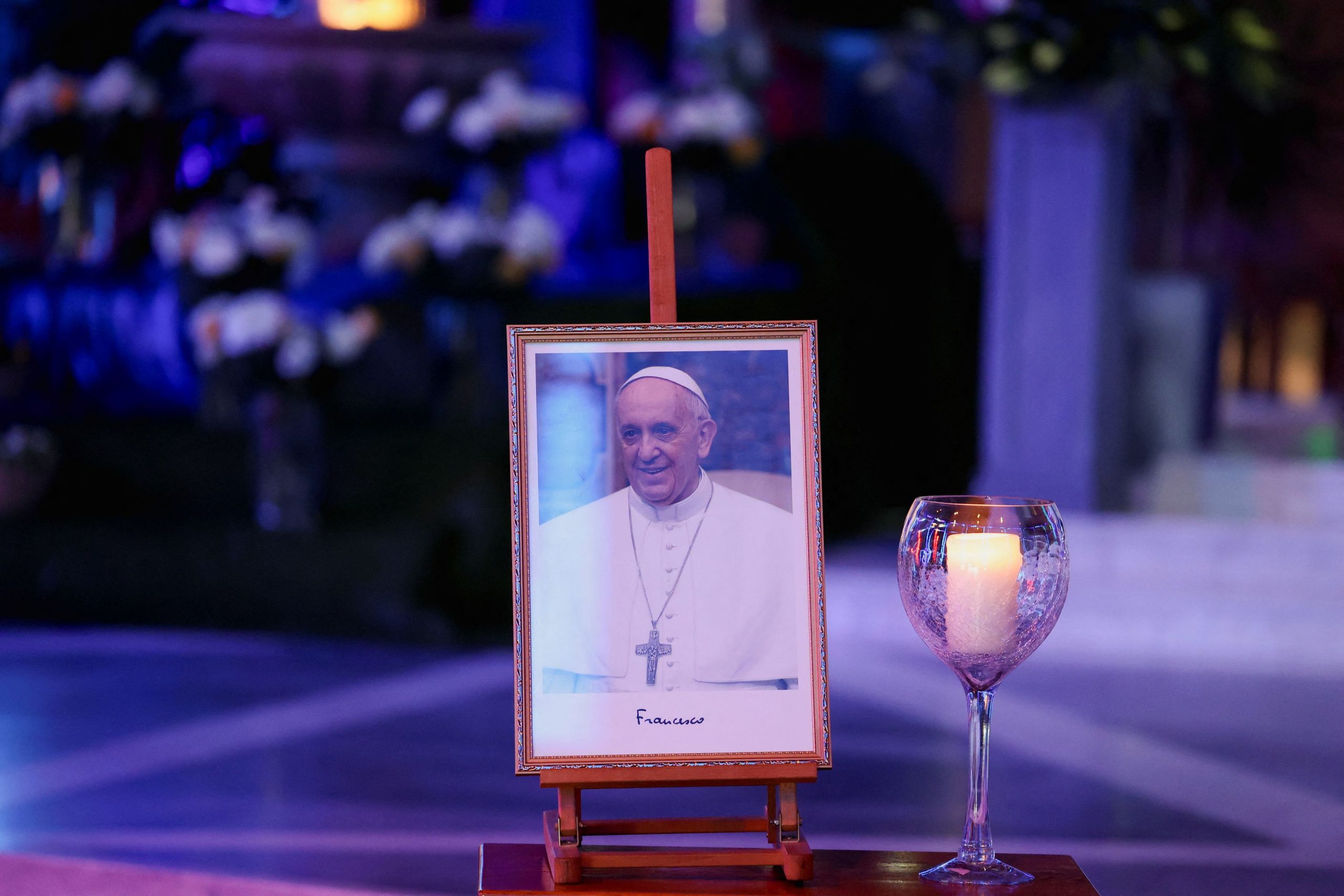 The portrait of Pope Francis is displayed at the Liverpool Metropolitan Cathedral, which is the largest Catholic cathedral in England, following the announcement of his death, in Liverpool Britain April 21, 2025. REUTERS/Temilade Adelaja
