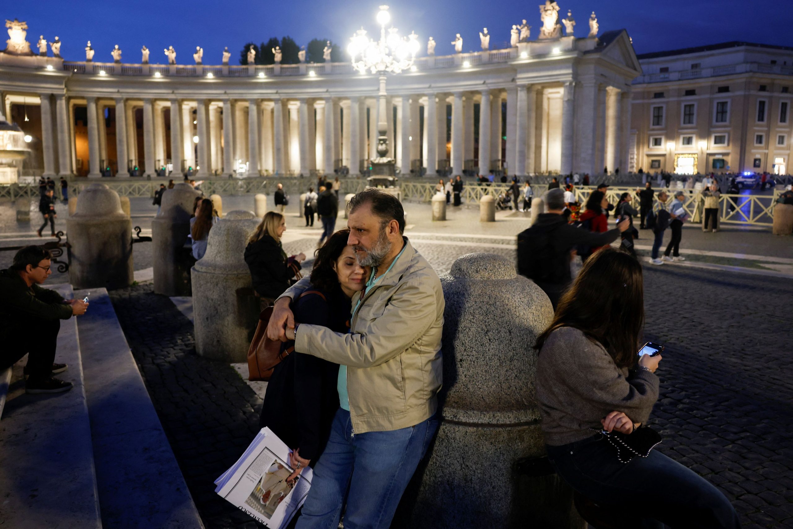 Faithful embrace after a rosary for Pope Francis, following the death of the pontiff, in St. Peter’s square, at the Vatican, April 21, 2025. REUTERS/Susana Vera