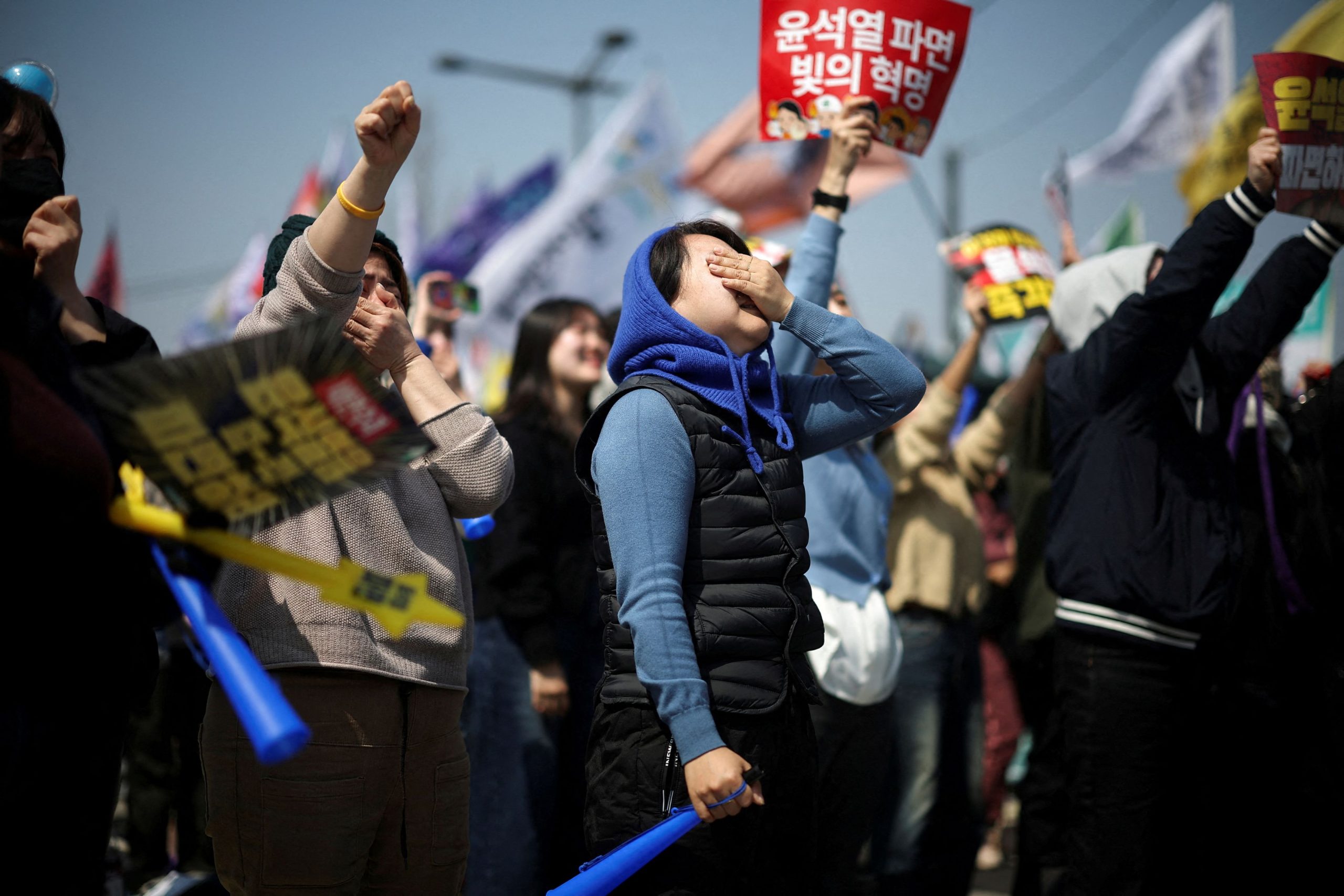 People celebrate after President Yoon Suk Yeol’s impeachment was accepted, near the Constitutional Court in Seoul, South Korea, April 4, 2025. REUTERS/Kim Hong-ji TPX IMAGES OF THE DAY