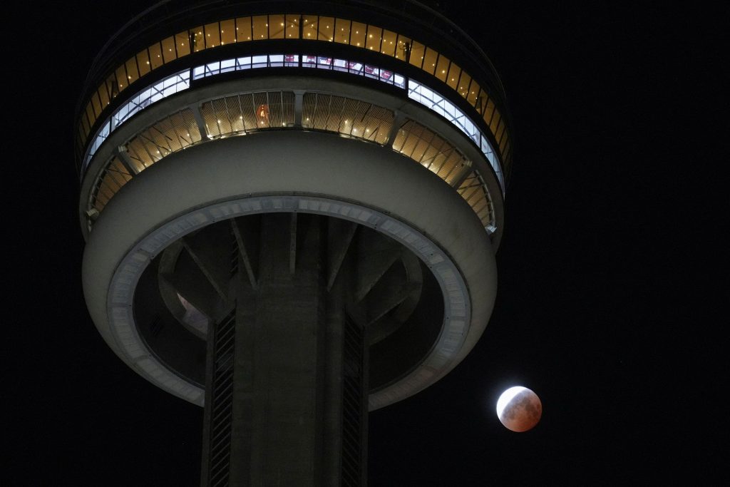 A full moon is seen behind the CN Tower during a “Blood Moon” lunar eclipse in Toronto, Ontario, Canada, March 14, 2025. REUTERS/Arlyn McAdorey