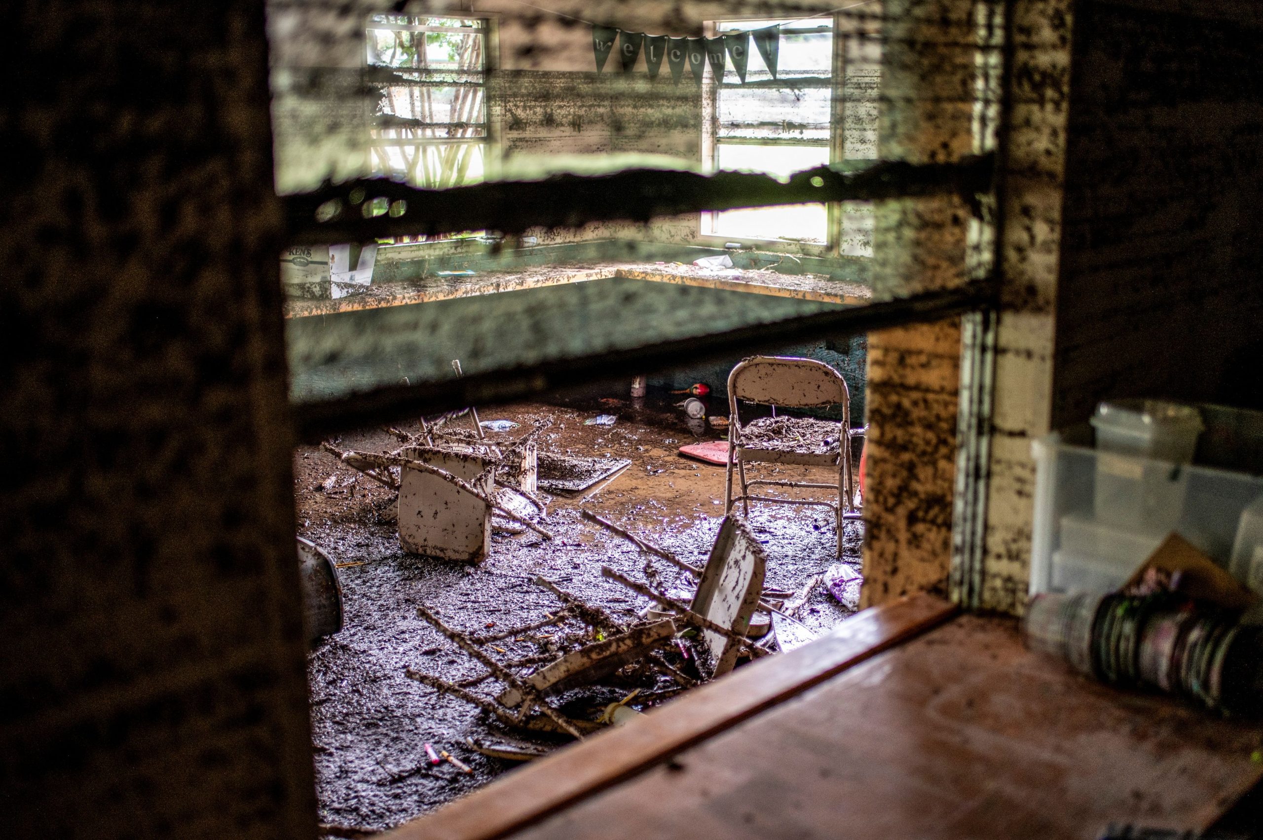 Chairs lie inside a damaged room in a cabin at Camp Mystic in the aftermath of deadly flooding in Kerr County, Texas, U.S., July 7, 2025. REUTERS/Sergio Flores