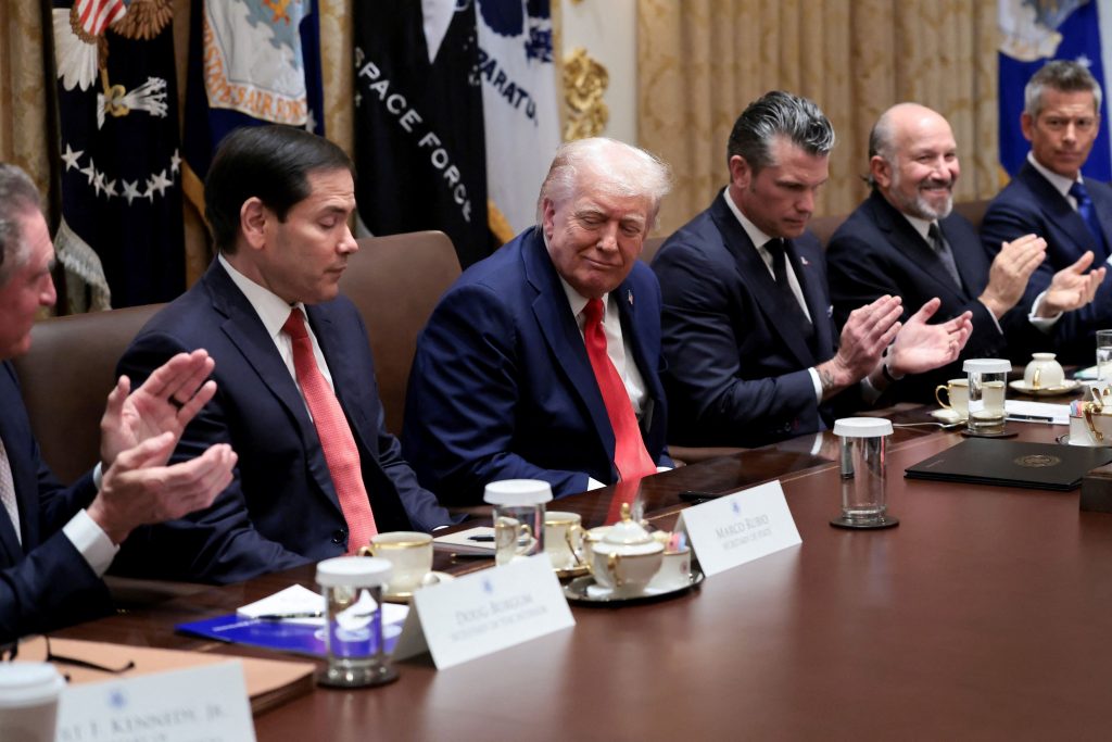 U.S. President Donald Trump reacts as Secretary of State Marco Rubio speaks about Israel and Hamas agreeing on the first phase of a Gaza ceasefire, during a cabinet meeting at the White House in Washington, D.C., U.S., October 9, 2025. REUTERS/Evelyn Hockstein