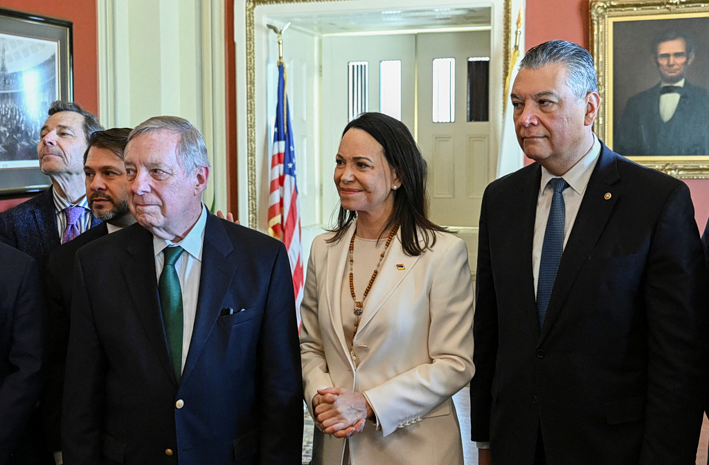 Venezuelan opposition leader Maria Corina Machado stands with U.S. Senator Dick Durbin (D-IL), U.S Senator Alex Padilla (D-CA) and U.S. Senator John Curtis (R-UT), as she meets U.S. senators after her meeting with U.S. President Donald Trump at the White House, on Capitol Hill in Washington, D.C., U.S., January 15, 2026. REUTERS/Annabelle Gordon