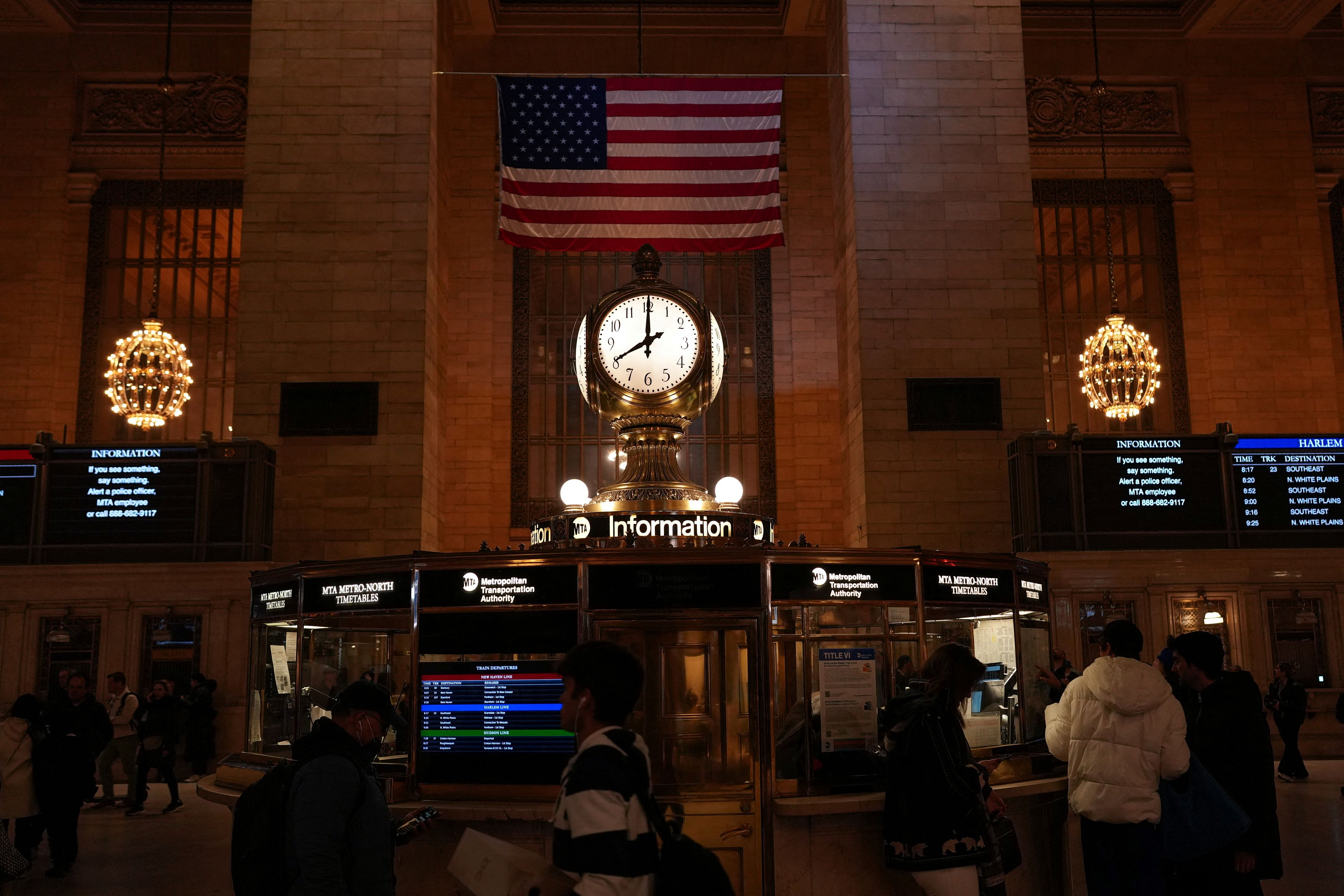 The clock inside the Grand Central Terminal shows 8 PM (ET), the postponed deadline set by U.S. President Donald Trump for Iran to reopen the Strait of Hormuz or face widespread attacks on its civilian infrastructure, in New York City, U.S., April 7, 2026. REUTERS/Adam Gray