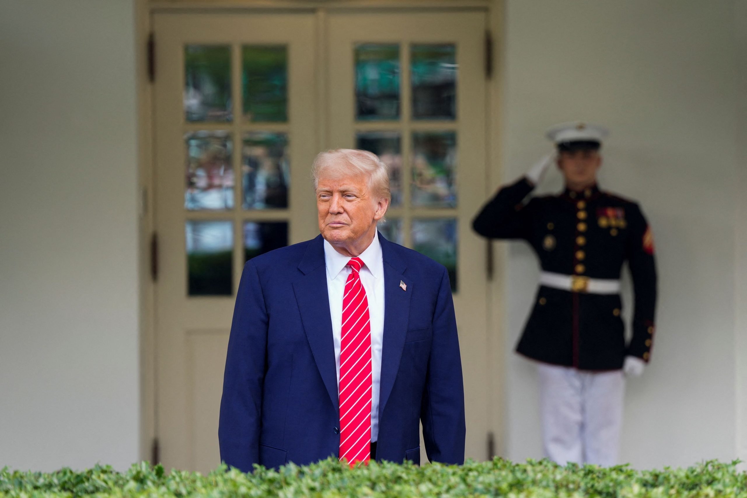 U.S. President Donald Trump looks on as he gives remarks outside the West Wing at the White House in Washington, D.C., U.S., May 8, 2025. REUTERS/Kent Nishimura