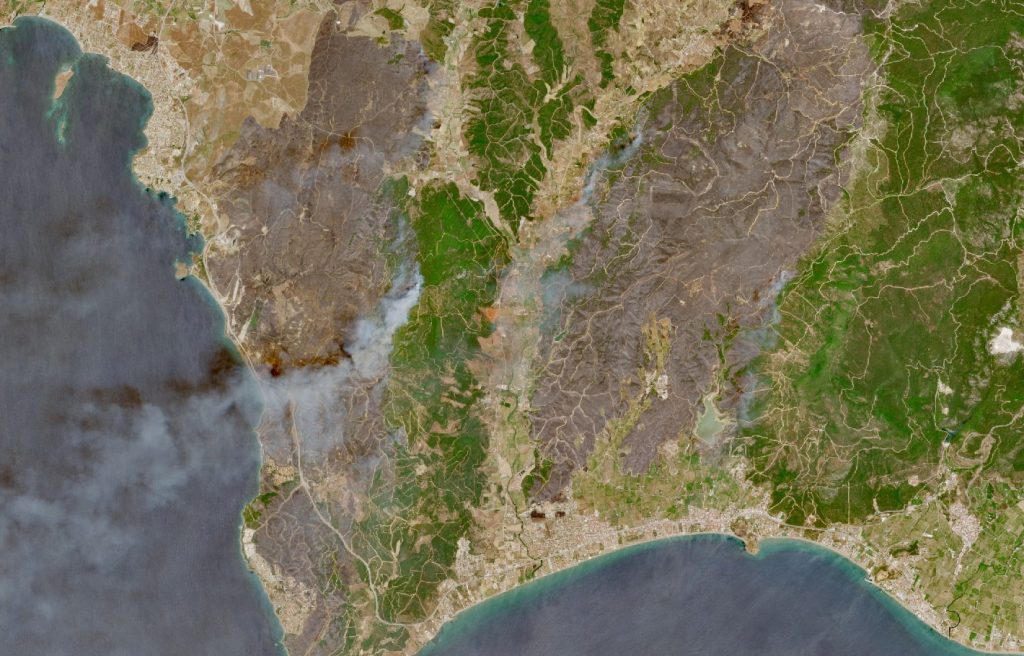A satellite image shows smoke rising due to a fire in the Izmir province, Turkey, June 30, 2025. European Union/Copernicus Sentinel-2/Handout via REUTERS THIS IMAGE HAS BEEN SUPPLIED BY A THIRD PARTY. MANDATORY CREDIT. PICTURED TONED AT SOURCE.