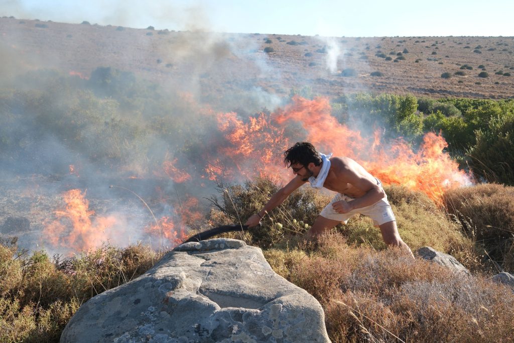 A person responds to a wildfire near Alacati in Izmir province, Turkey, July 3, 2025. REUTERS/Murat Kocabas