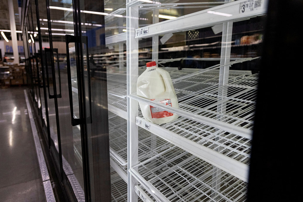 A milk container lies in a nearly empty refrigerated case as food supplies thin while residents prepare for an approaching winter storm in St. Louis, Missouri, U.S., January 23, 2026. REUTERS/Lawrence Bryant