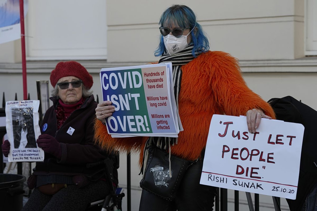 COVID campaigners and families of those who died during the pandemic hold placards as they protest outside the COVID Inquiry at Dorland House, where British Prime Minister Rishi Sunak is giving evidence, in London, Monday, Dec. 11, 2023. Sunak was Chancellor of the Exchequer during the pandemic and is likely to be questioned about the impact of his policies such as the Eat Out to Help Out scheme had on the spread of the outbreak. (AP Photo/Frank Augstein)