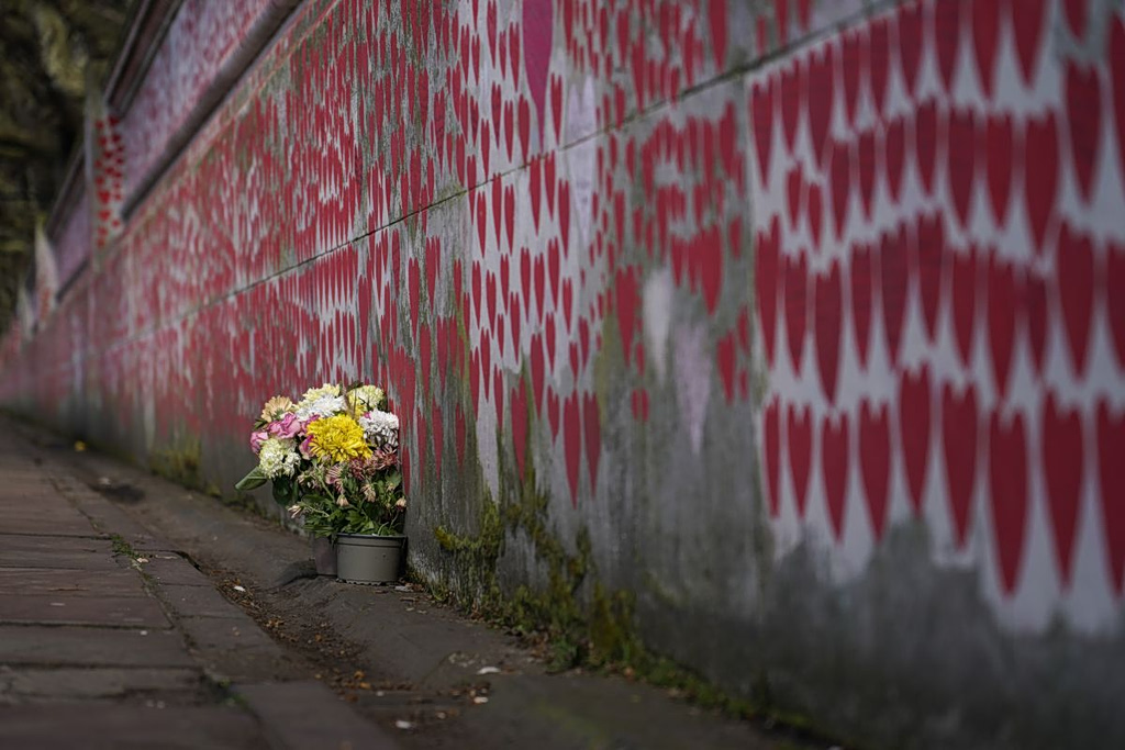 Flowers are left at the National Covid Memorial Wall, on the south bank of the river Thames in London, Thursday, March 14, 2024.(AP Photo/Alberto Pezzali)