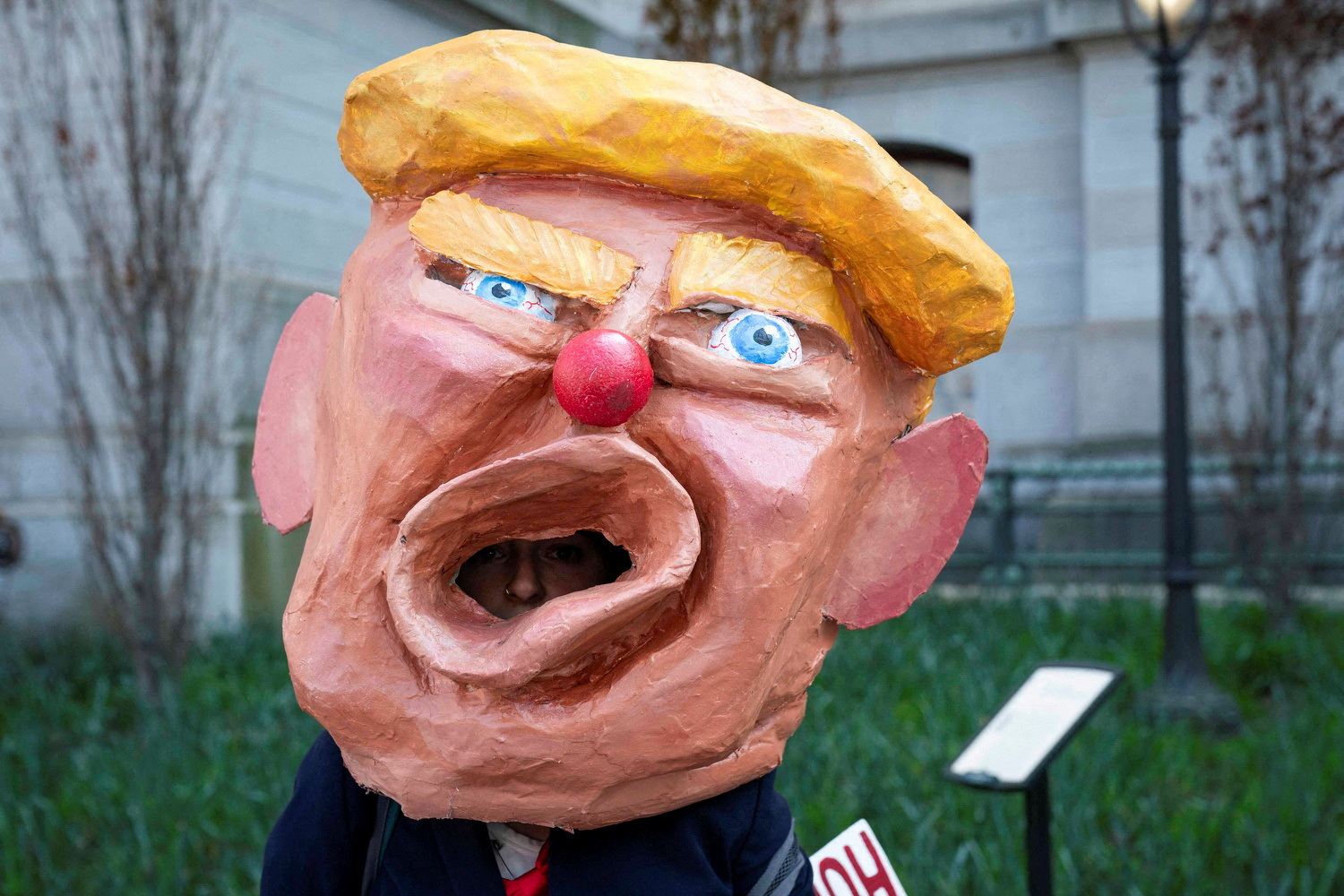 A demonstrator in a homemade Trump mask attends a May Day Strong – ‘For the Workers, Not the Billionaires’ rally, in Philadelphia, Pennsylvania, U.S., May 1, 2025. REUTERS/Sarah Silbiger TPX IMAGES OF THE DAY