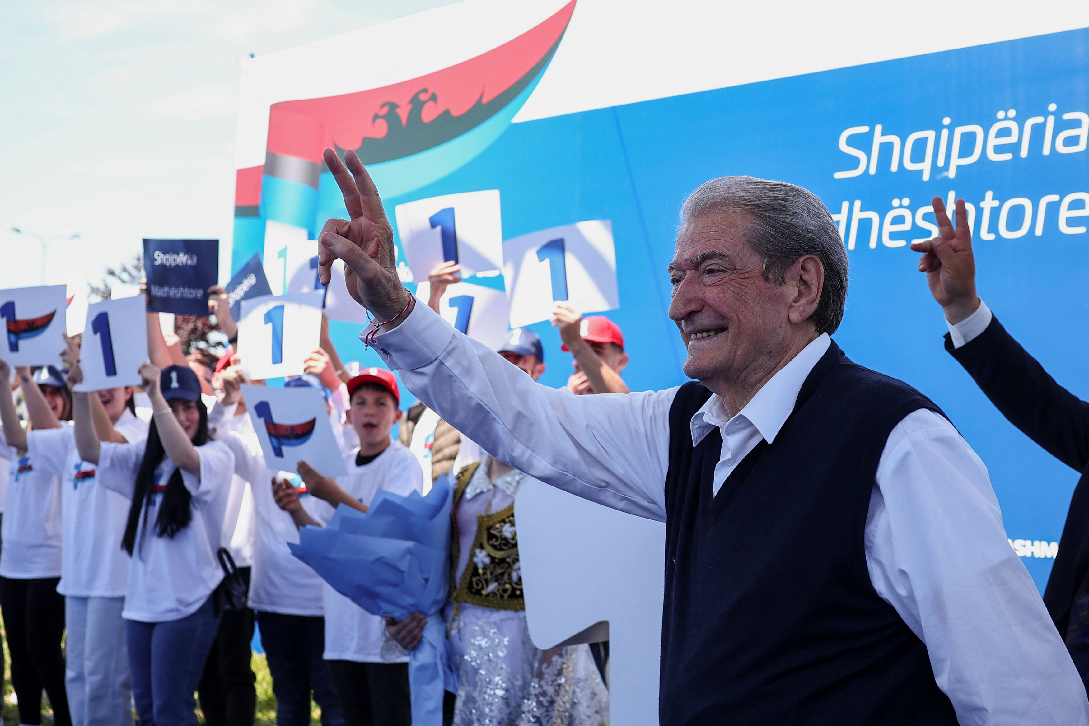 Leader of the Democratic party Sali Berisha waves to his supporters during an electoral rally in Belsh, Albania, May 1, 2025. REUTERS/Florion Goga