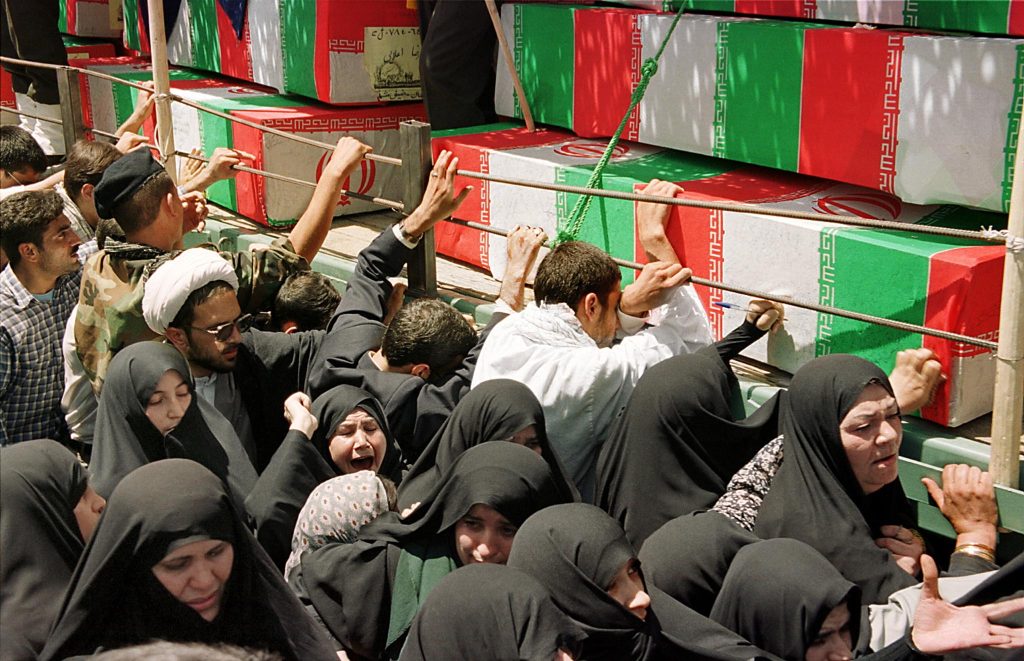 Iranians reach out to touch coffins wrapped in Iranian flags on military trucks during a state funeral for 300 soldiers, killed during Iran’s war with Iraq, after Friday prayers in Tehran 26 May 2000. The bodies were discovered 12 years after the end in 1988 of the eight-year war, during which 300,000 Iranians were killed and half a million wounded, according to government estimates. EPA PHOTO AFP/ATTA KENARE