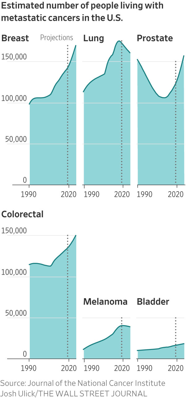 More than 690,000 people were projected to be living with stage-four or metastatic disease of the six most common cancers—melanoma, breast, bladder, colorectal, prostate or lung cancer —in 2025, according to a 2022 report from the National Cancer Institute. That’s an increase from 623,000 in 2018 and a significant rise since 1990, the report found.