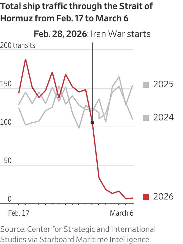 The Strait of Hormuz has been a critical trading entrepôt for centuries, a passageway between the Persian and Oman gulfs. Where the merchandise was once spices and silk, it is now a channel for 20% of the world’s oil and gas, as well as chemicals used in pharmaceuticals and commodities like fertilizer. For now, that trade is gone.