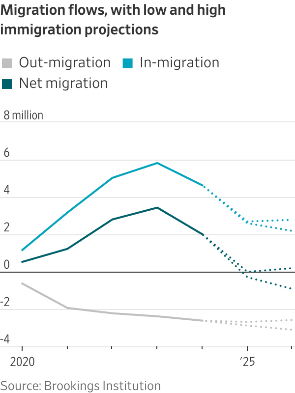 The U.S. experienced net negative migration—an estimated loss of some 150,000 people—in 2025, and the outflow will likely increase in 2026, according to calculations by the Brookings Institution, a public-policy think tank. The number could be larger or smaller because official U.S. data doesn’t yet fully capture the number of people leaving, Brookings analysts noted. The total in-migration was between around 2.6 and 2.7 million in 2025, down from a peak of almost 6 million in 2023.