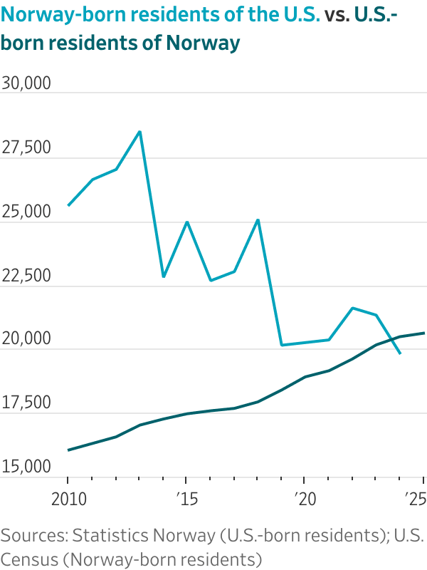 In his rallies, Trump has mused about attracting Norwegian immigrants. But the number of Norwegians living in the U.S. has fallen over the past 10 years, and in 2024, it crossed a symbolic milestone: There are now more natural-born Americans living in Norway than Norwegian-born residents in the U.S.