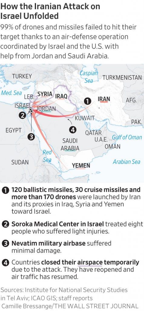That success was due to a combination of Israel’s sophisticated air-defense system and critical assistance provided by the U.S. and other Western and Arab partners. American, British and Jordanian warplanes played an especially important role in downing drones. Most of the Iranian drones and missiles were destroyed before they even reached Israeli airspace.