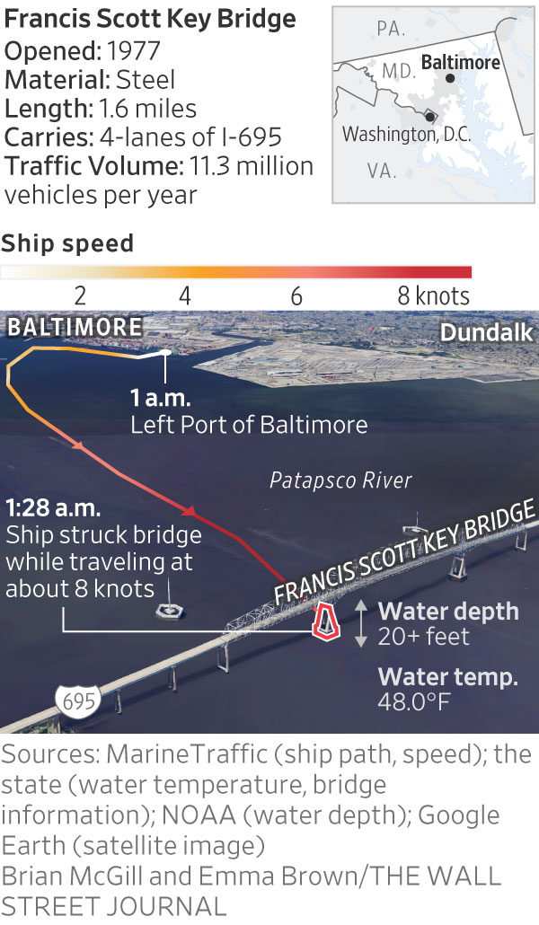 The lights on the Dali began to flicker about an hour after the ship began its voyage early Tuesday. A harbor pilot and assistant reported power issues and a loss of propulsion before the crash, according to a Coast Guard briefing report viewed by The Wall Street Journal.
