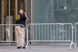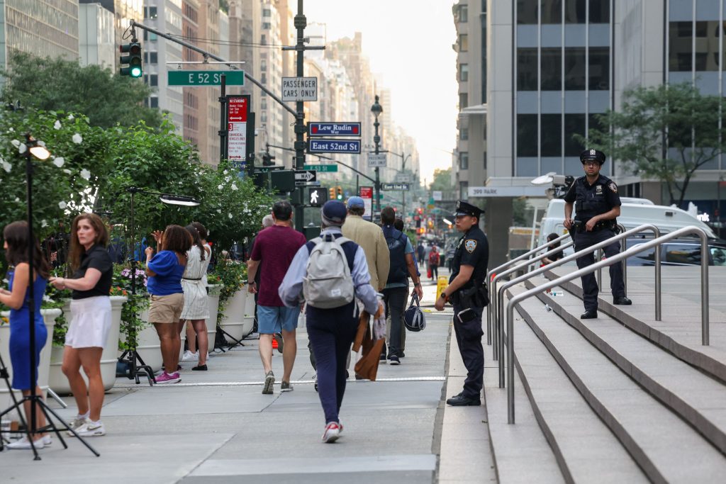 NYPD officers and media members stand along Park Avenue in front of the building where a shooting had taken place the day before, as pedestrians walk by, in the Manhattan borough of New York City, U.S., July 29, 2025. REUTERS/Kylie Cooper