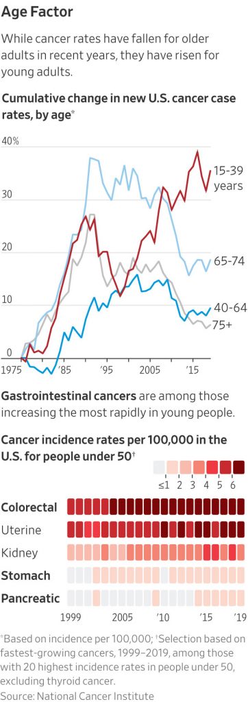 Some doctors suspect that cancer-causing exposures might have started during patients’ childhoods, something that is difficult to trace. Unlike when smoking drove up lung cancer deaths in the 20th century, doctors suspect there isn’t a single carcinogen responsible for the current trends. Some worry young people’s rising cancer risks are a sign of deeper trouble.
