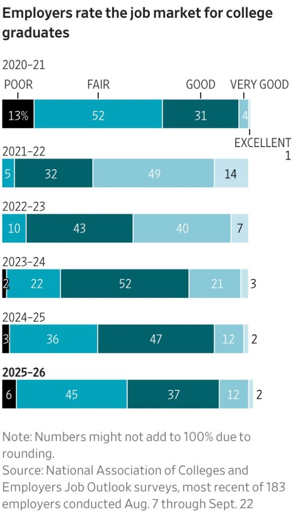 Six months out from graduation season, more than half of 183 employers surveyed by the National Association of Colleges and Employers rate the job market for the Class of 2026 as poor or fair. That is the most pessimistic outlook since the first year of the pandemic, according to the survey, which is widely seen as an early signal of graduate hiring each year.