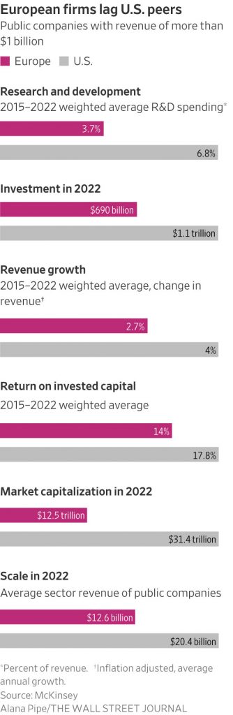 In a recent study, the McKinsey Global Institute noted Europe’s internal market is larger than China’s and almost as big as the U.S.’s. But when it compared companies with more than $1 billion in revenue, the U.S. firms spent 80% more on research and development, boasted 30% higher return on capital, and 1.3-percentage points faster revenue growth.