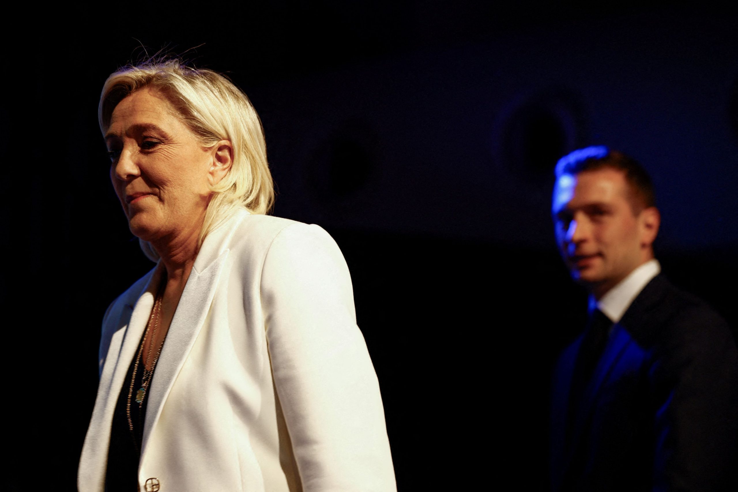 Jordan Bardella, President of the French far-right National Rally (Rassemblement National – RN) party and head of the RN list for the European elections, and Marine Le Pen, President of the French far-right National Rally party parliamentary group, take the stage to address party members after the polls closed during the European Parliament elections, in Paris, France, June 9, 2024. REUTERS/Sarah Meyssonnier TPX IMAGES OF THE DAY