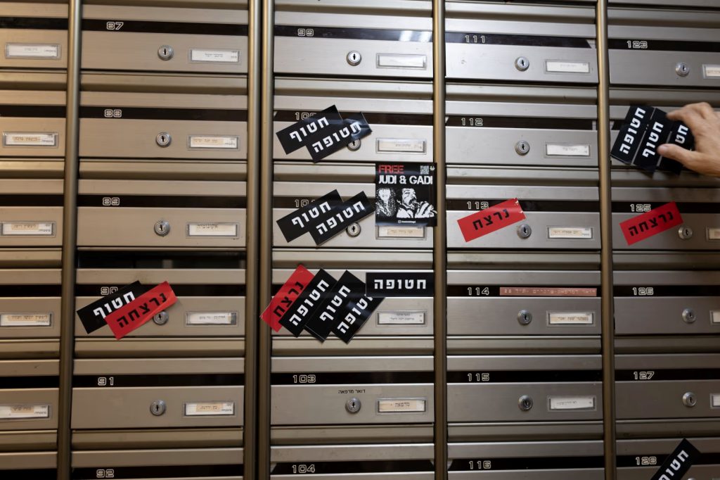 Mailboxes for Nir Oz residents are labeled ‘abducted,’ in black, and ‘murdered,’ in red. | Photography by Maya Alleruzzo for WSJ