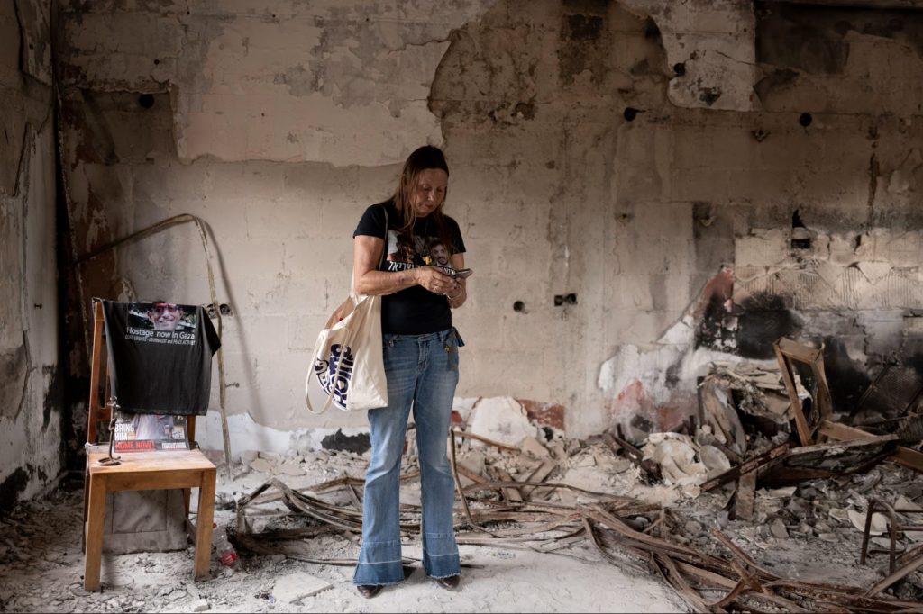 Rita Lifshitz stands in the ruins of the home where her mother and father-in-law, peace activists Yocheved and Oded Lifshitz, were captured. Yocheved returned, but Oded was killed in captivity. | Photography by Maya Alleruzzo for WSJ