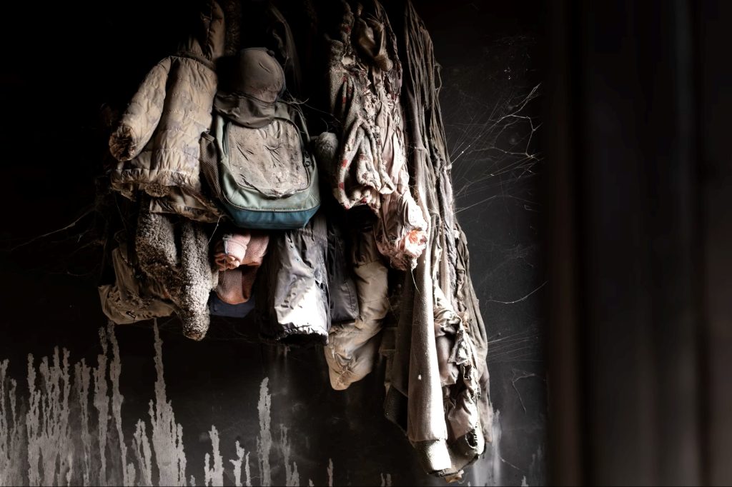 A family’s coatrack remains as it was on Oct. 7, 2023. | Photography by Maya Alleruzzo for WSJ