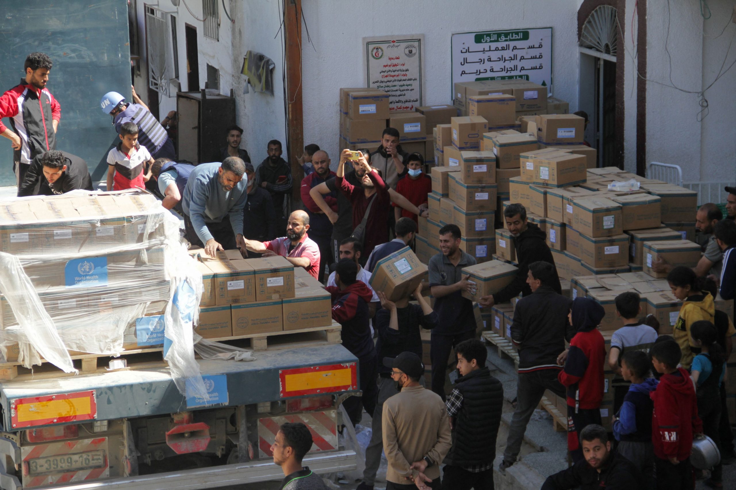 People unload medical aid from a truck, near Kamal Adwan Hospital in the northern Gaza Strip, amid the ongoing conflict between Israel and Hamas, April 6, 2024. REUTERS/Mahmoud Issa