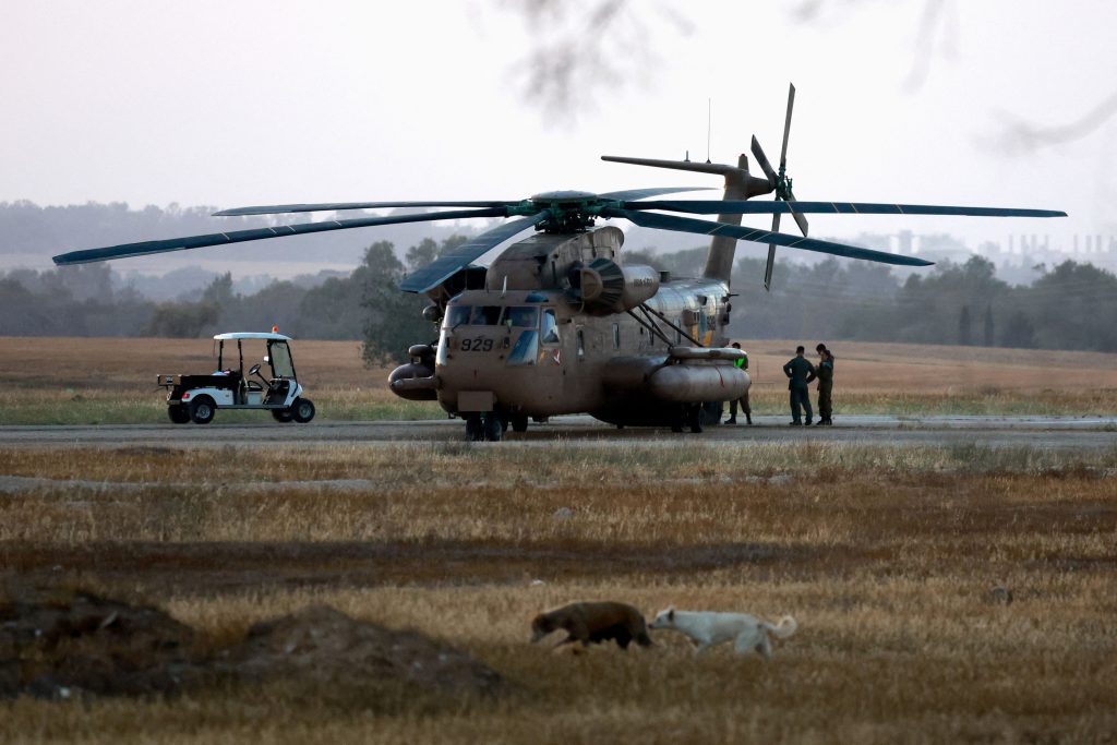 Dogs walk near an Israeli military helicopter after Israeli-American former hostage Edan Alexander, who had been kidnapped during the deadly October 7, 2023, attack on Israel, was released from captivity by Hamas, in Reim, Israel May 12, 2025. REUTERS/Ammar Awad