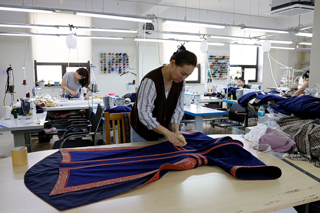 An employee works on a deel, one of Goyol Cashmere’s Team Mongolia outfits for the 2026 Winter Olympics, at its factory in Ulaanbaatar, Mongolia, February 5, 2026. REUTERS/B. Rentsendorj